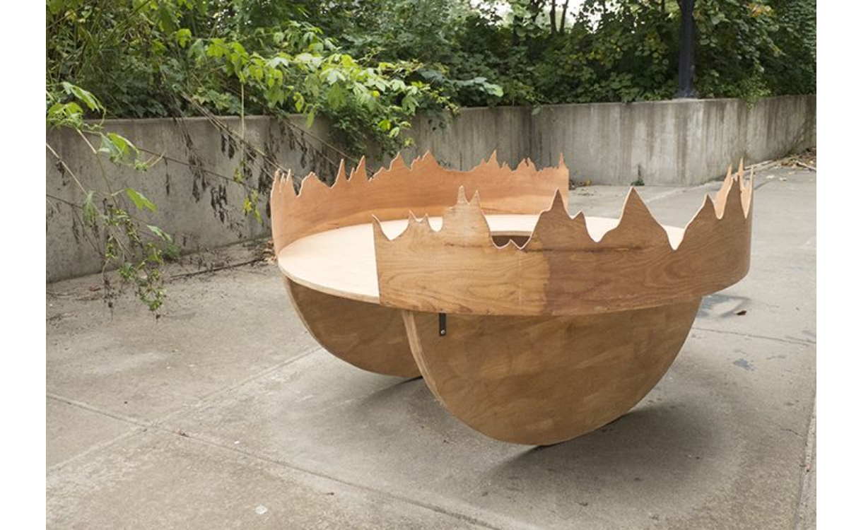 This wood sculpture explores the invisible tension and balance needed in conversing with others. Constructed as a seesaw, this sculpture can only maintain balance when two people are sitting.